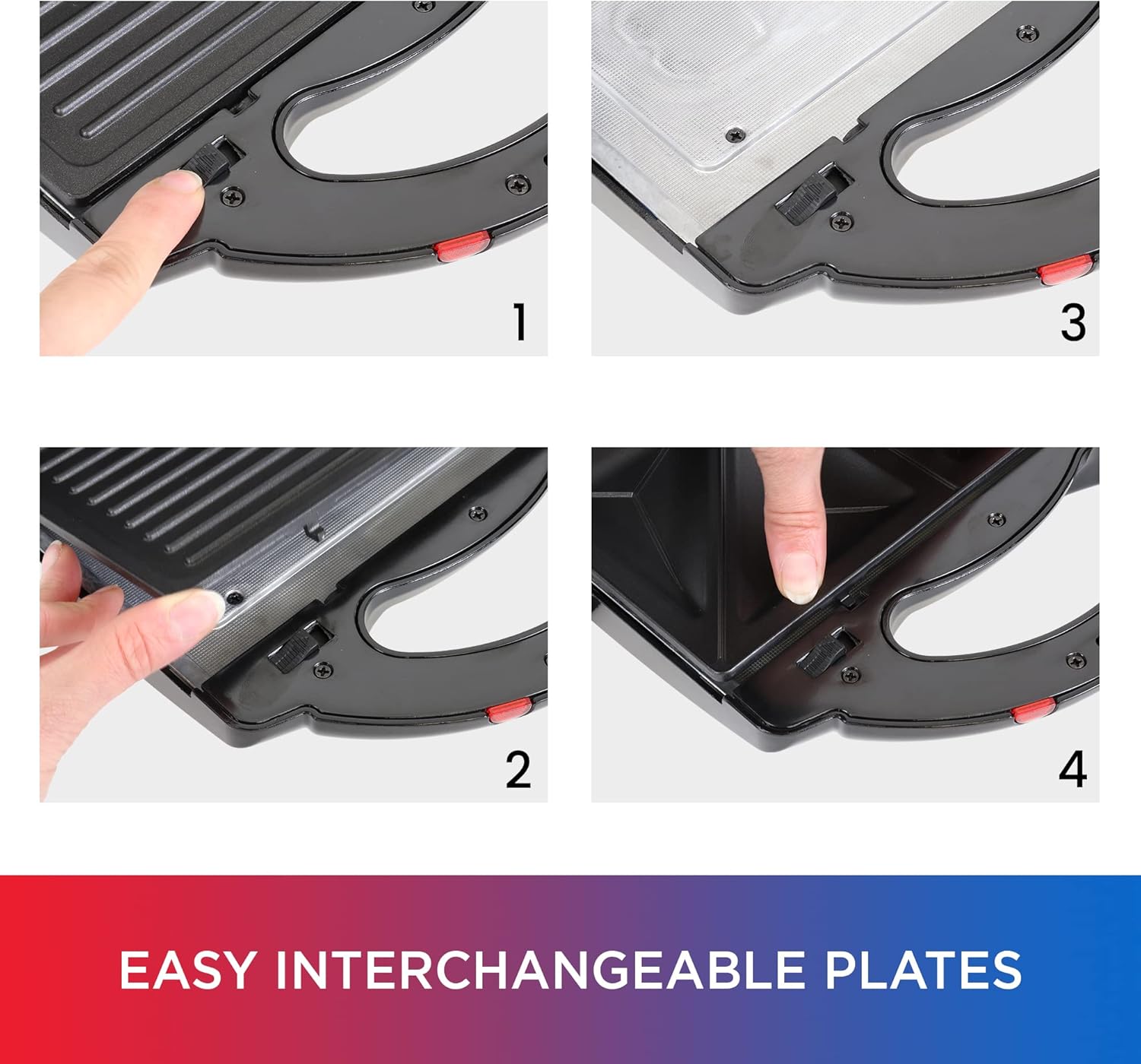 - 4 IN 1 COUNTERTOP COOKING - The appliance comes with four interchangeable non-stick cast iron plates, transforming it into a grilled cheese sandwich maker, griddle, panini press, or waffle iron. This feature offers endless creative cooking possibilities, making it a versatile addition to any kitchen.
