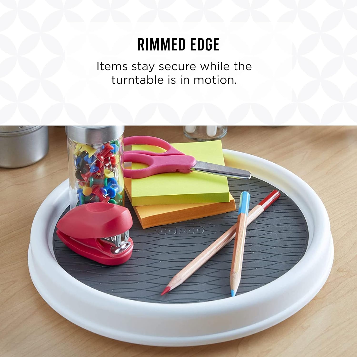 - RIMMED EDGE: The outer rim prevents items from falling off, non-skid surface keeps items in place while rotating. Durable, easy-to-clean polypropylene with non-skid beaded surfaces