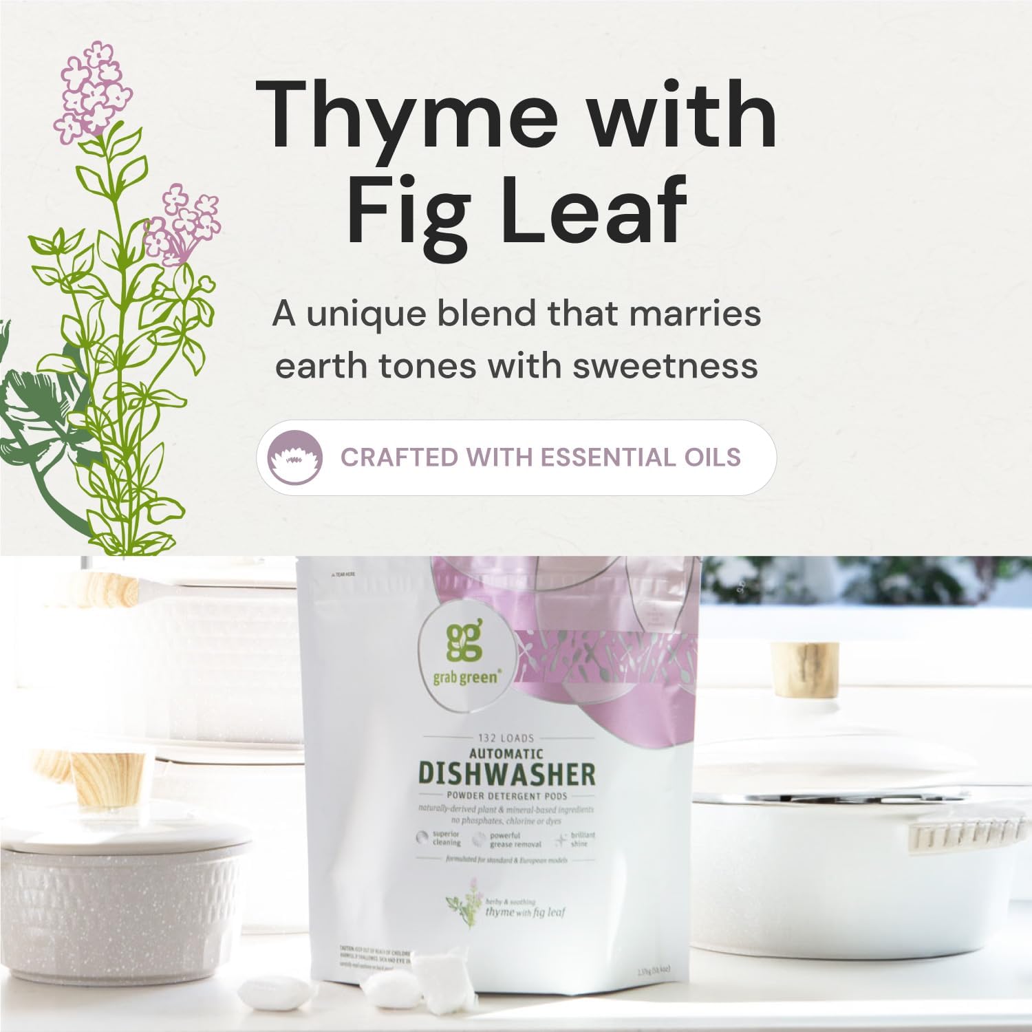 - Contains: 1- 60 Pod Bag of Grab Green Natural Thyme with Fig Leaf Automatic Dishwashing Detergent Pods. Our velcro closure bags are convenient and easy to use, no hassling with frustrating zip closures