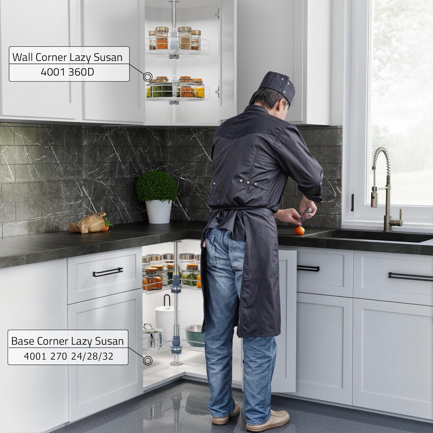 - DESIGNED FOR BASE CORNER CABINETS: Each shelf is kidney shaped (also called pie shaped or 270 degrees) in order to fit easily inside a base corner kitchen cabinet with a hinged diagonal door. The actual diameter of the lazy susan is 28" so the ideal cabinet size is 33" with an internal clearance of 36". No part of the lazy susan will attach to the door. Final assembly must be completed inside the cabinet to ensure fit.
