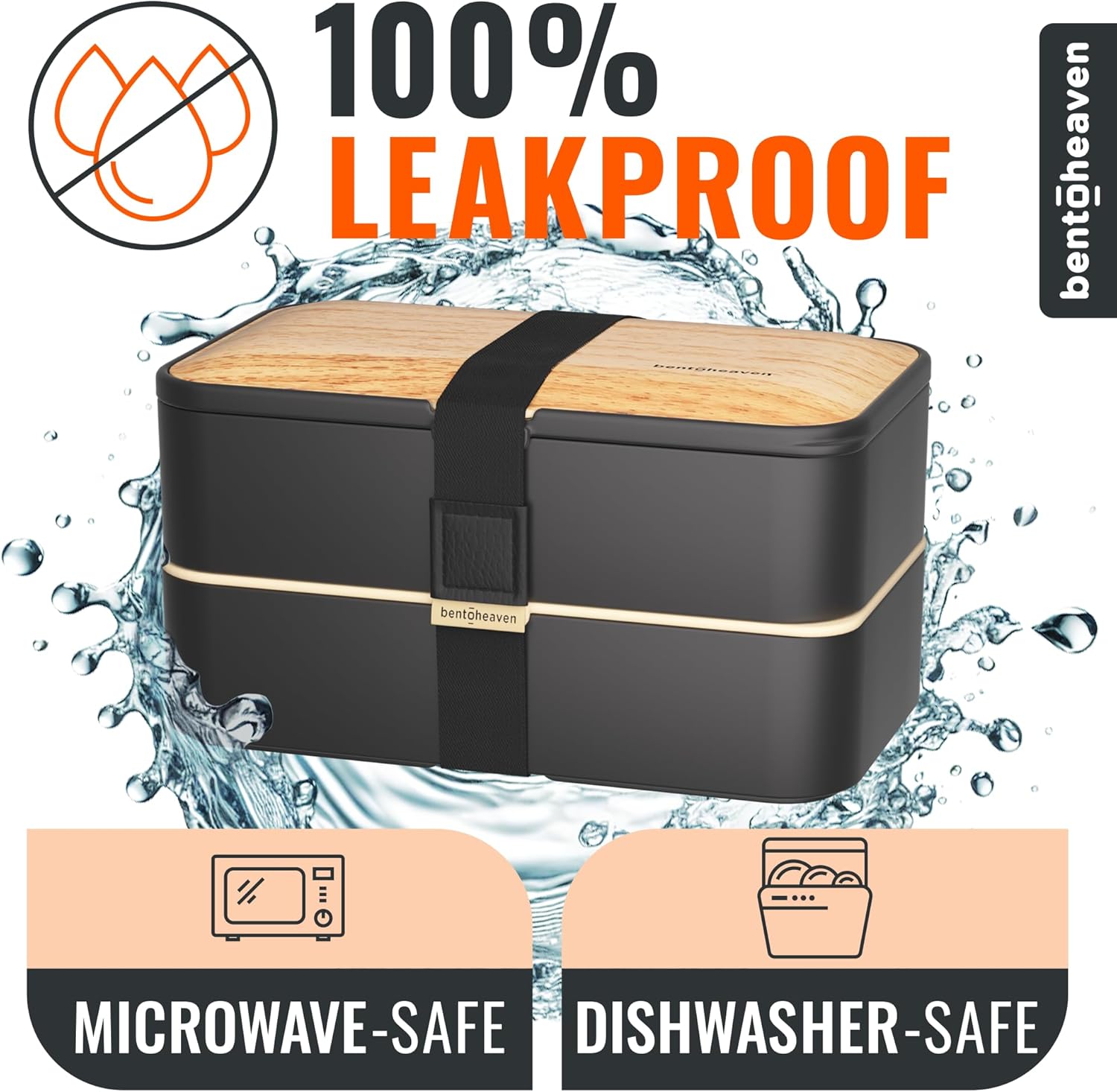 Bentoheaven Premium Bento Box Adult Lunch Box with Compartments for Women & Men, Set of Utensil & Chopsticks & Dip Container, Cute Japanese Kids Bento Lunch Box, Microwavable (Symph Onyx)