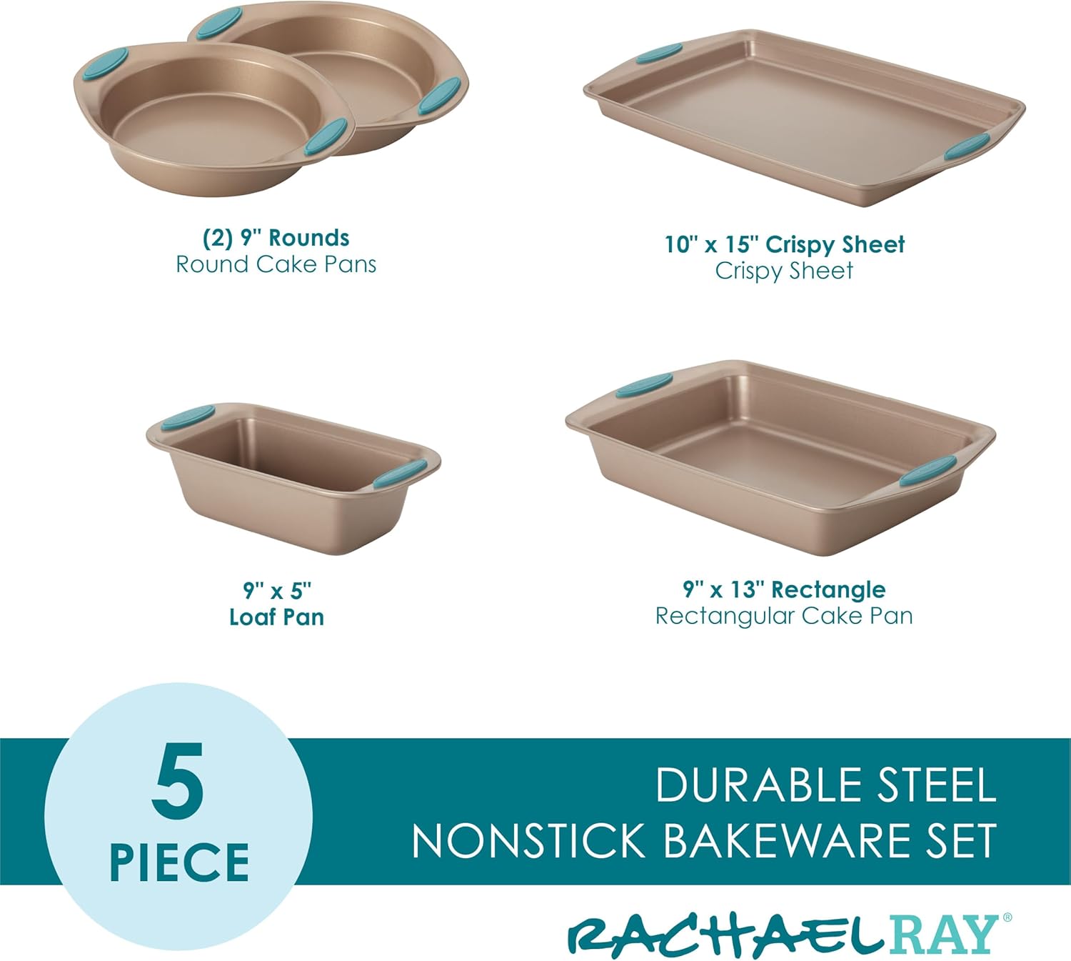 Rachael Ray Cucina Bakeware Set Includes Nonstick Bread Baking Cookie Sheet and Cake Pans, 5 Piece, Latte Brown with Agave Blue Grips