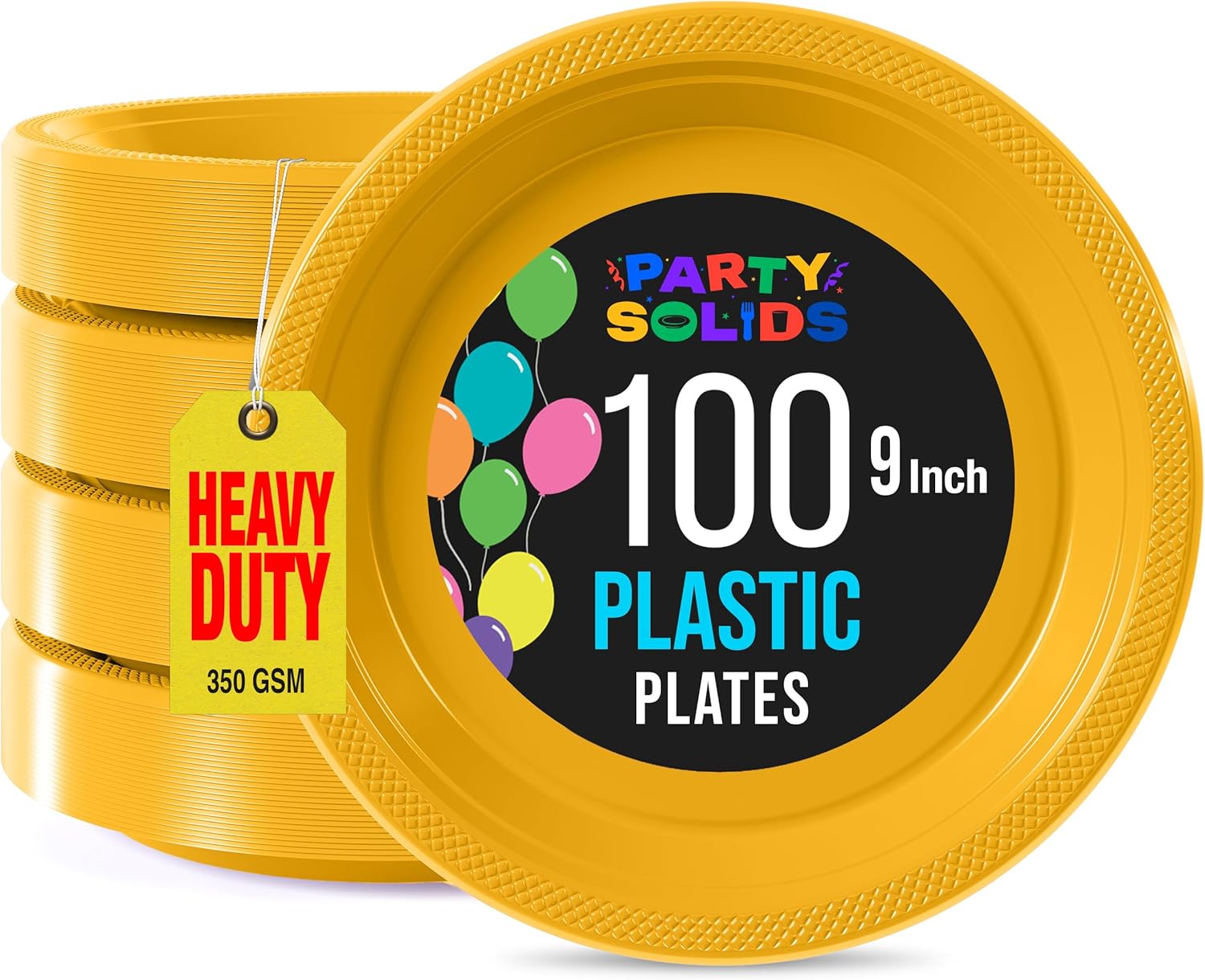 - Includes: Each pack comes with 100 Yellow 9 inch dinner plates. These plates may be used as dinner plates or cake plate and also make a great use as picnic supplies. Having these will complete your plastic dinnerware collection.