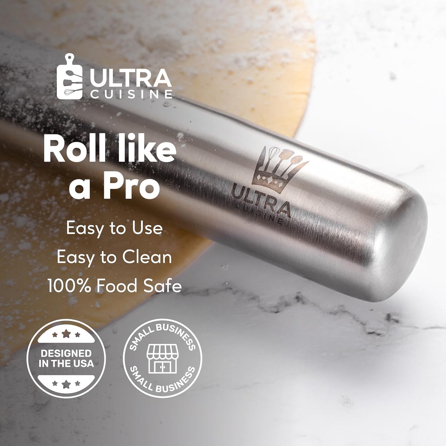 Ultra Cuisine French Rolling Pin for Baking – Use with Pizza, Cookie, and Pastry Dough, Fondant and Pie Crust – Tapered Design Bread Roller Pin, Stainless Steel 15.75-inch Large Roller Pin