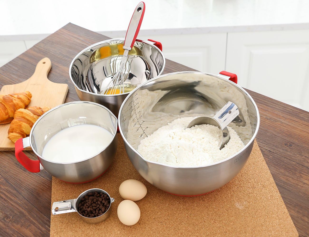 Rorence Mixing Bowls with Lids Set: Stainless Steel Mixing Bowls with Handles, Non-Slip Bottom & Pour Spout - Red, 3 quarts