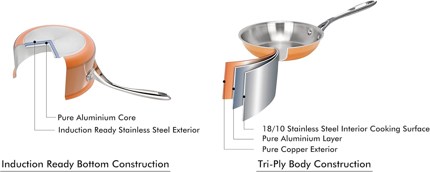 - All bodies and lids are constructured from Tri-Ply: Pure copper + Pure Aluminum + S/S 18/10 for ideal cooking results.