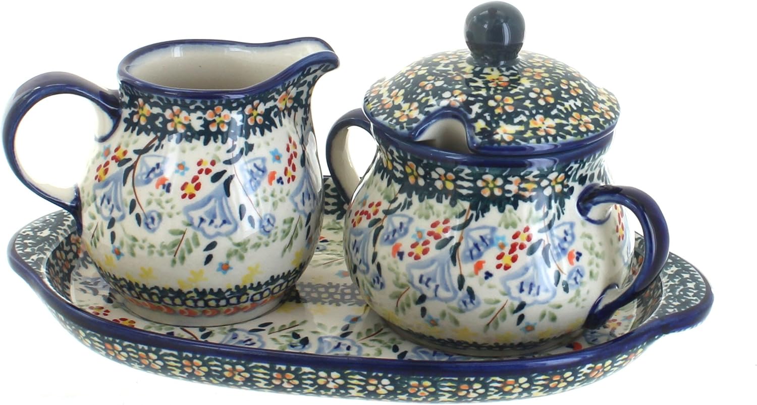 Blue Rose Polish Pottery Periwinkle Sugar & Creamer with Tray