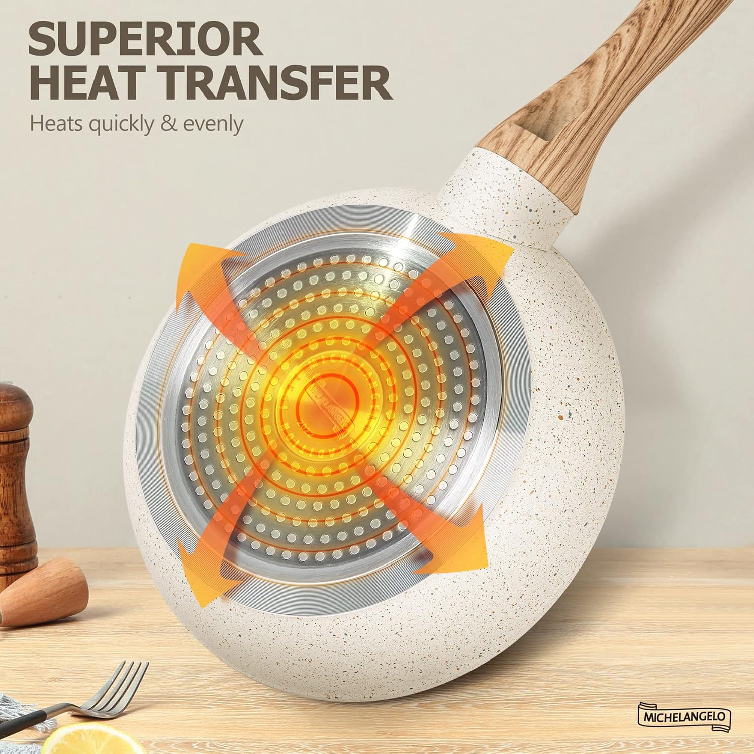 - Healthy & Non-toxic - The natural mineral nonstick coating is ultra durable while remaining 100% free of PFOA, PTFA, lead, and cadmium, ideal for healthy cooking. Choose Michelangelo White Granite Frying Pan with lid for greener and safer cooking.