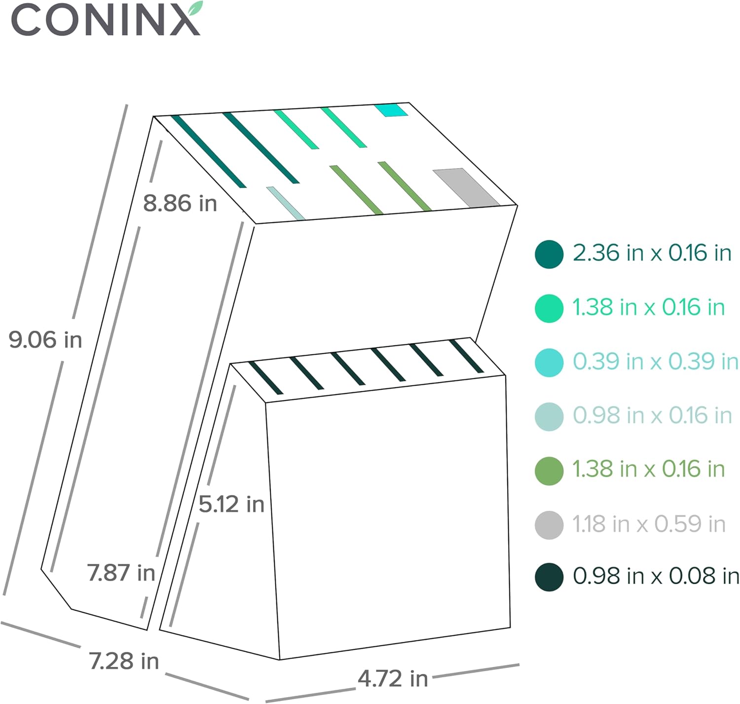 - AFFORDABLE QUALITY THAT LASTS: This universal knife rack is more than just a steak knife block. It features premium materials and first-class workmanship without the high price-tag of similar quality products. Given it's produced from a natural product, it's impossible to have two knife blocks in exactly the same color or with the same wood grains. The pictures show already a slight color difference on the same knife block. In other words, with this Coninx knife holder you're buying a unique item.