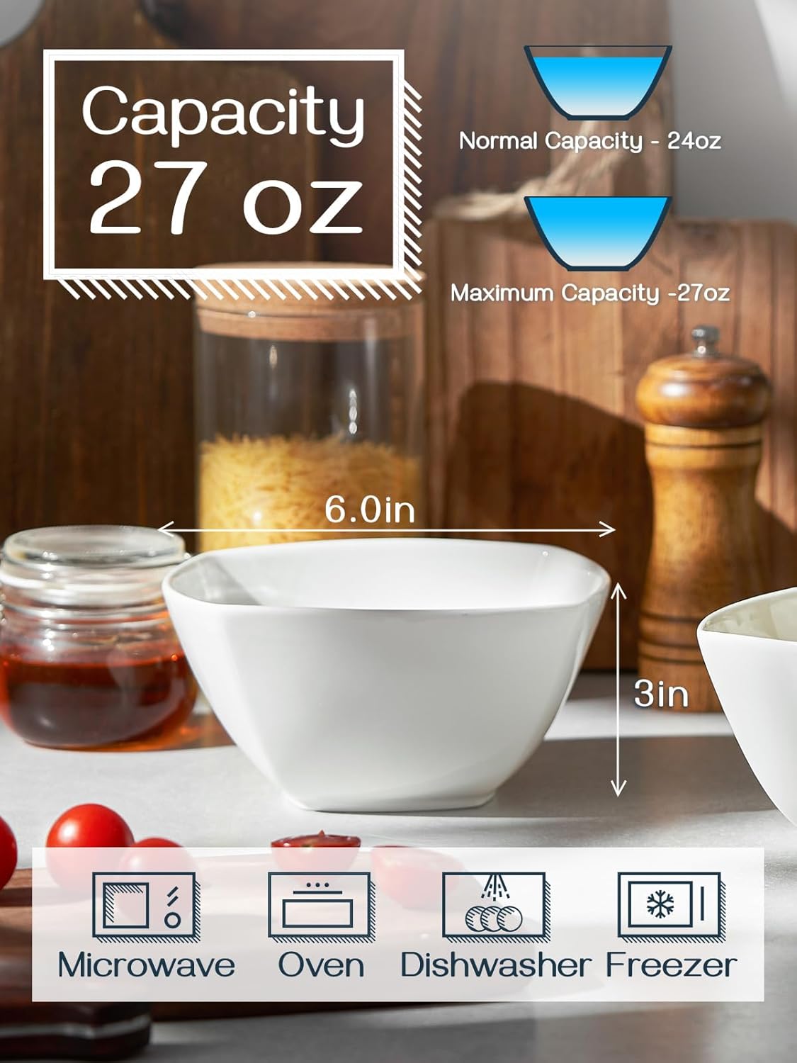 DOWAN Porcelain Soup Bowls Set of 6, 27 OZ Ceramic Square Cereal Bowls, White Bowl, for Ice Cream and Dessert Snack, Wedding Party Gift, Microwave Safe Bowl