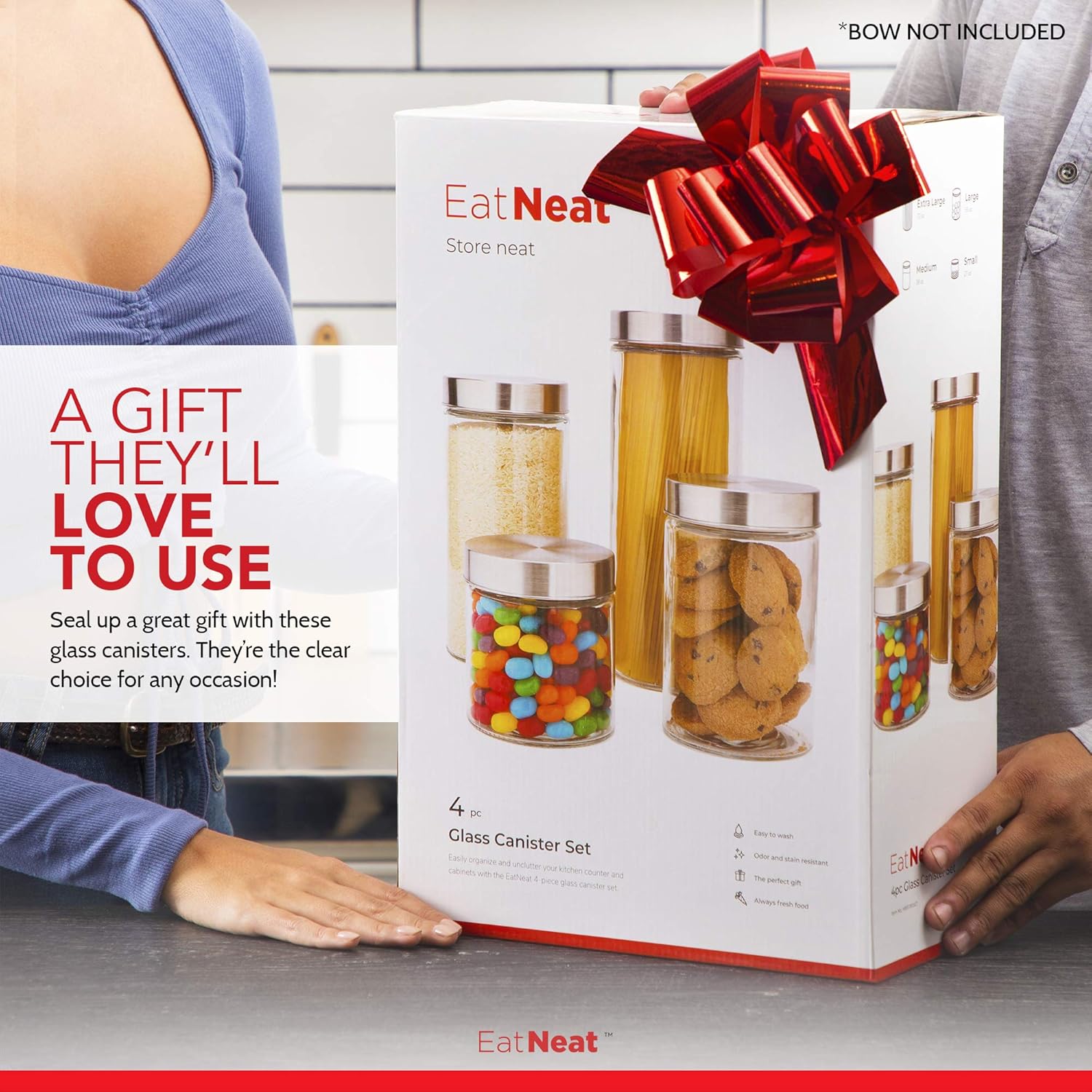 EatNeat 4-Piece Sleek Glass Canister Set with Brushed Stainless Steel Lids – Giftable, Durable Storage Containers for Countertop Use – Dishwasher-Safe Jars in Various Sizes for Pantry & Kitchen