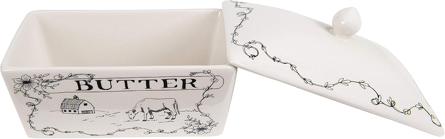 - This farmhouse-inspired butter dish features a vintage silhouette finished with intricate line drawings of a farm landscape, florals, and "spread the love" message