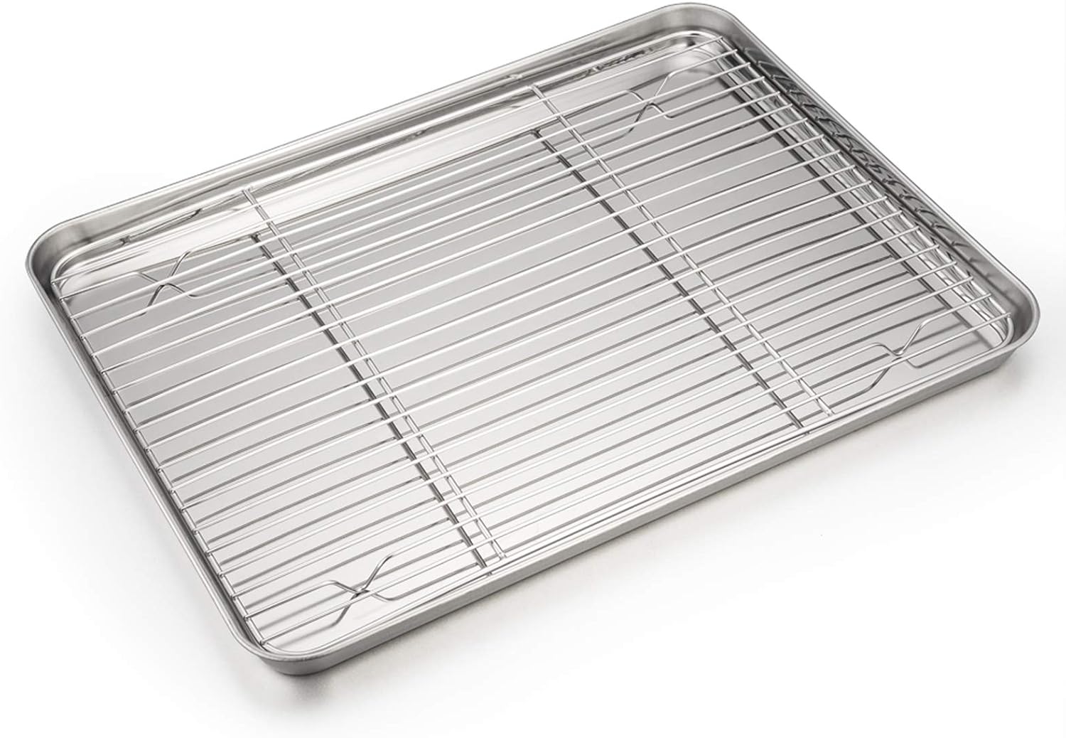 - 【CRAFTED】The baking pan has smooth and shiny mirror finish surface, Roll edges with no sharp spot, The parallel lines of the wire rack is dense to keep food from falling through