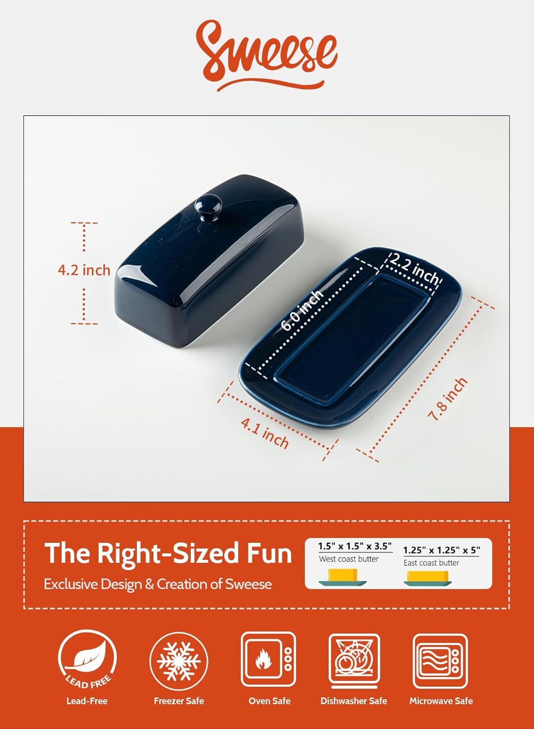 - Large Capacity - This butter holder is 7.8โ long and 4.1โ wide, and the 4.2" tall lid has enough capacity to easily accommodate a full "American size" stick of butter, including east/west coast butter; without worrying about the butter hitting the top or sides of the lid. A properly sized butter container can be conveniently placed in the refrigerator or counter space.