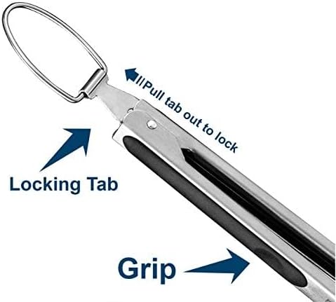 - CONVENIENT FEATURES TO MAKE YOUR COOKING MORE PRODUCTIVE– We added features to these handy tools to make your life just a bit easier. They all have steel hanging rings to keep you organized. The long-handle flipper has serrated cutting edge and a bottle opener, so you can enjoy a cold beer or drink while cooking. The scalloped tongs have a soft, non-slip handle with locking tab.