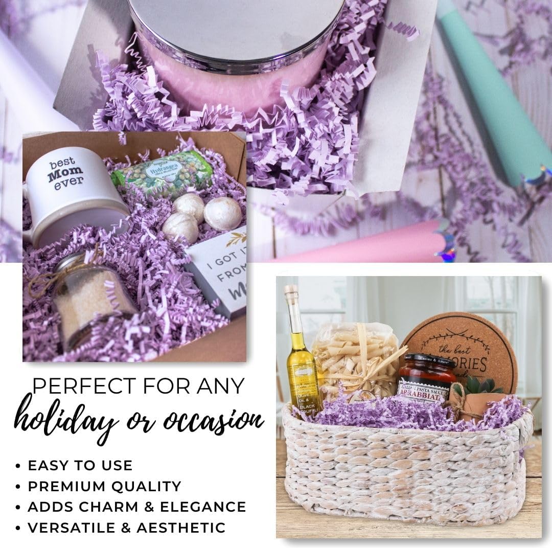 - VERSATILE GIFT WRAPPING & PACKAGING: Our 2 LB Lavender crinkle paper filler is perfect for creating eye-catching displays in gift bags, gift boxes, and baskets. Fill those extra spaces with premium Lavender filler paper, ensuring your gifts stand out at any event.