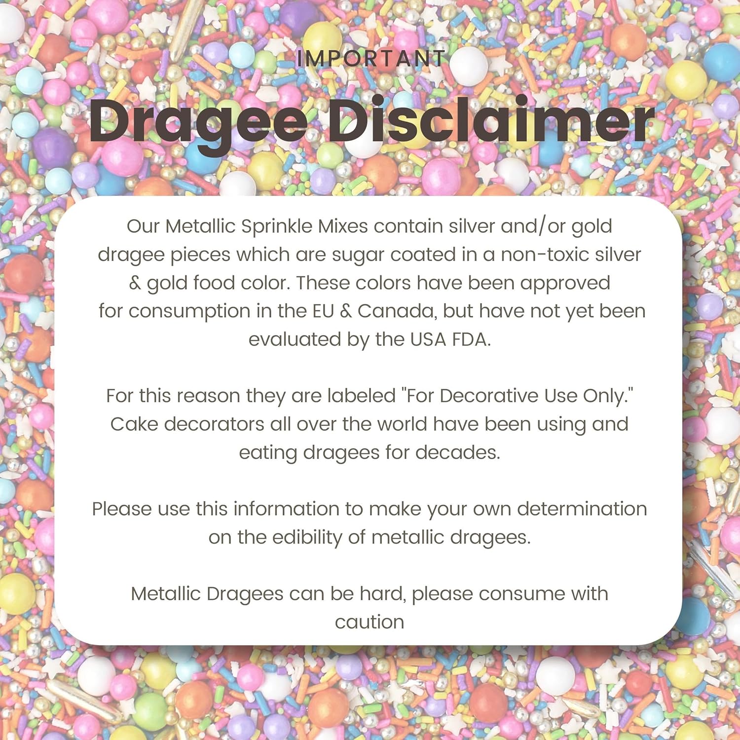 - Metallic Dragees Disclaimer: Silver and gold dragees are commonly used by cake decorators worldwide. While approved for consumption in some regions, they are traditionally labeled as βFor Decorative Use Onlyβ in the U.S. Please use discretion when adding them to your creations