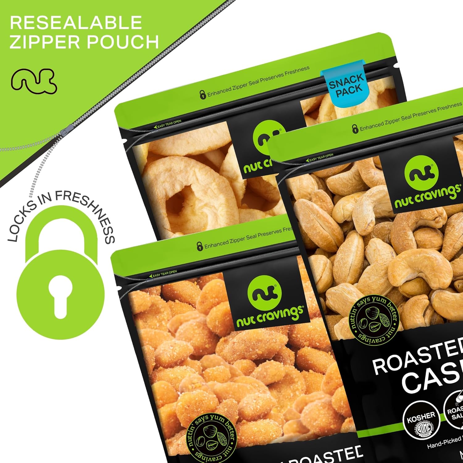 - MEGA BUNDLE WITH 6 BAGS OF OUR SIGNATURE SNACKS: Our 6-bag Mega Bundle Gift Basket includes 6 bags, each of them filled with one of these delicious snacks: Honey Roasted Peanuts, Roasted & Salted Crunchy Corn Kernels, Roasted & Salted Almonds, Roasted & Salted Cashews, Dried Apple Rings, Dried Mango Strips!
