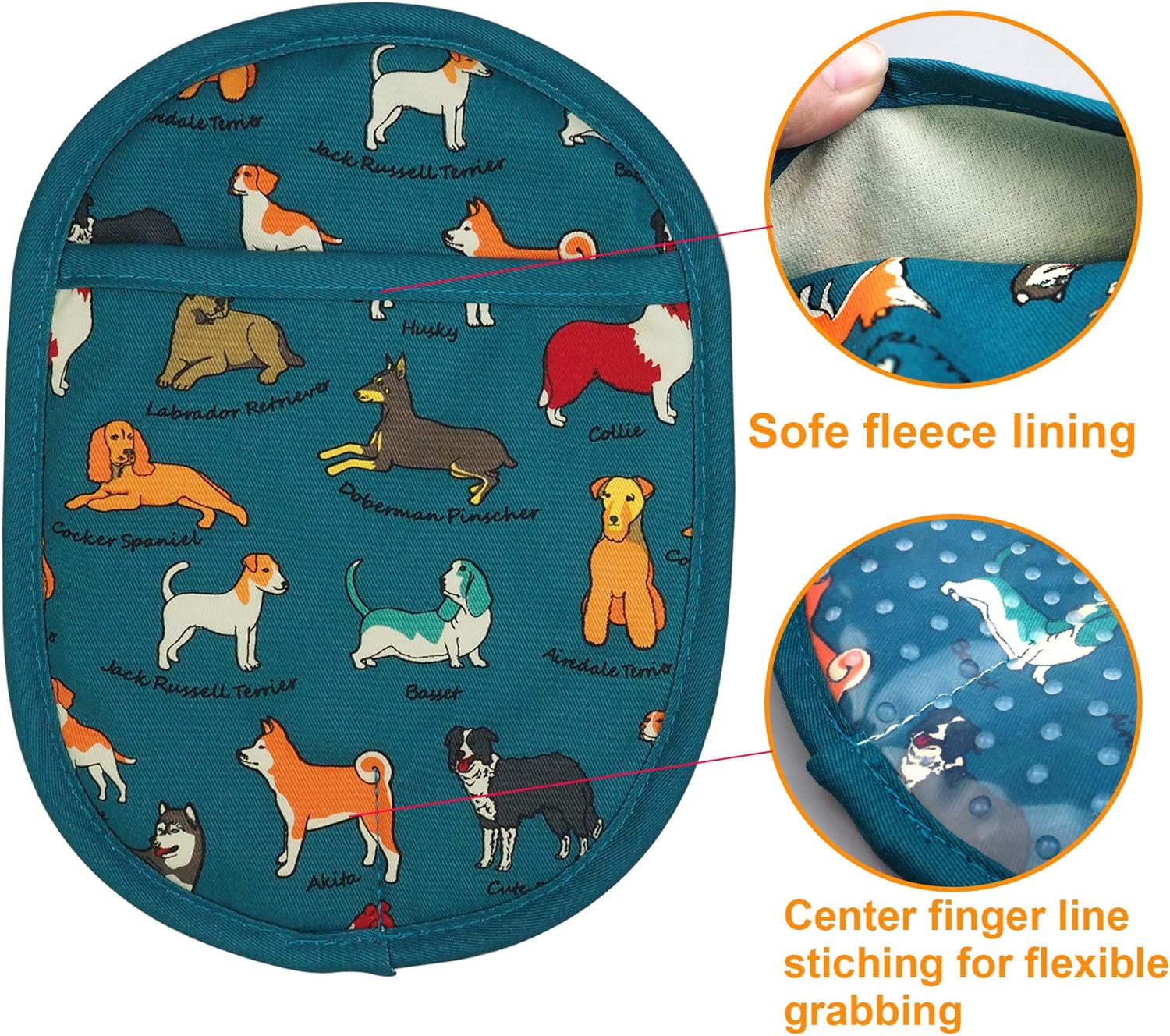 Pot Holders Set of 2 with Transparent Clear Silicone Shell and Nice Dog Flower Cotton Lining, Heat Resistant to 500 F Kitchen Oven Gloves Pot Holder for Cooking (Blue Dog, Potholders)