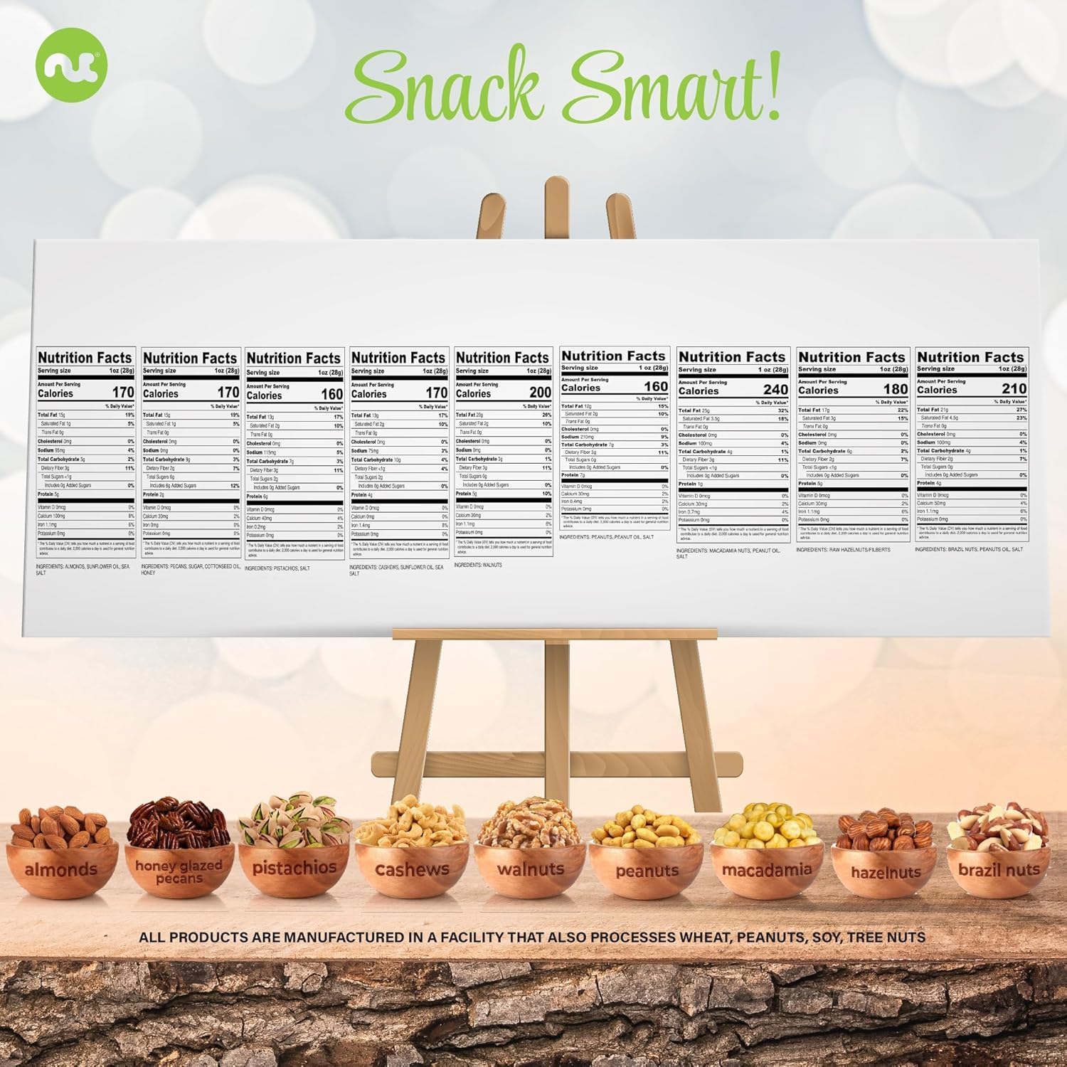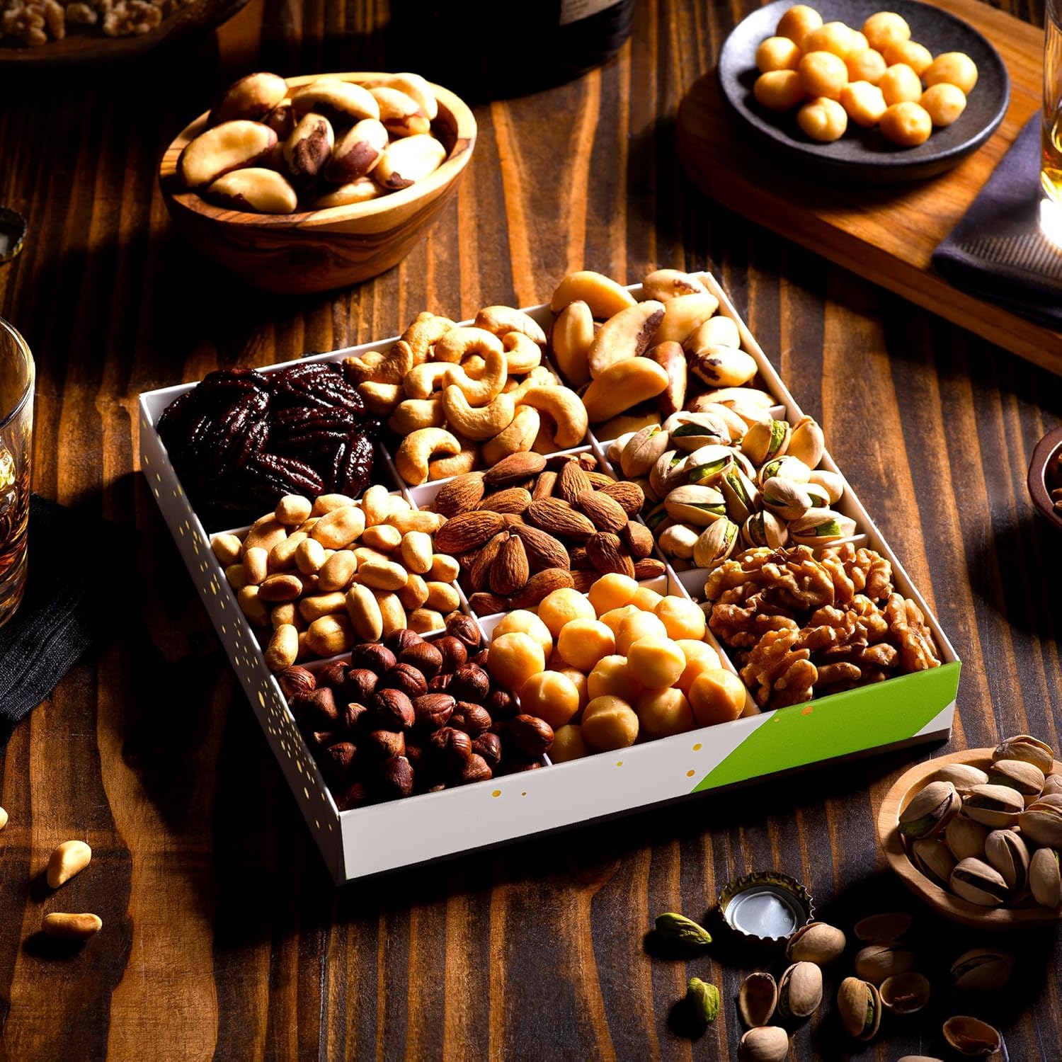 - A SELECTION OF 9 OF OUR BEST NUTS: Our Green & White Gift Box includes a handful of 9 of our signature nuts: Honey Glazed Pecans, Cashews, Brazil Nuts, Pistachios, Walnuts, Almonds, Blanched Hazelnuts, Hazelnuts, and Peanuts.