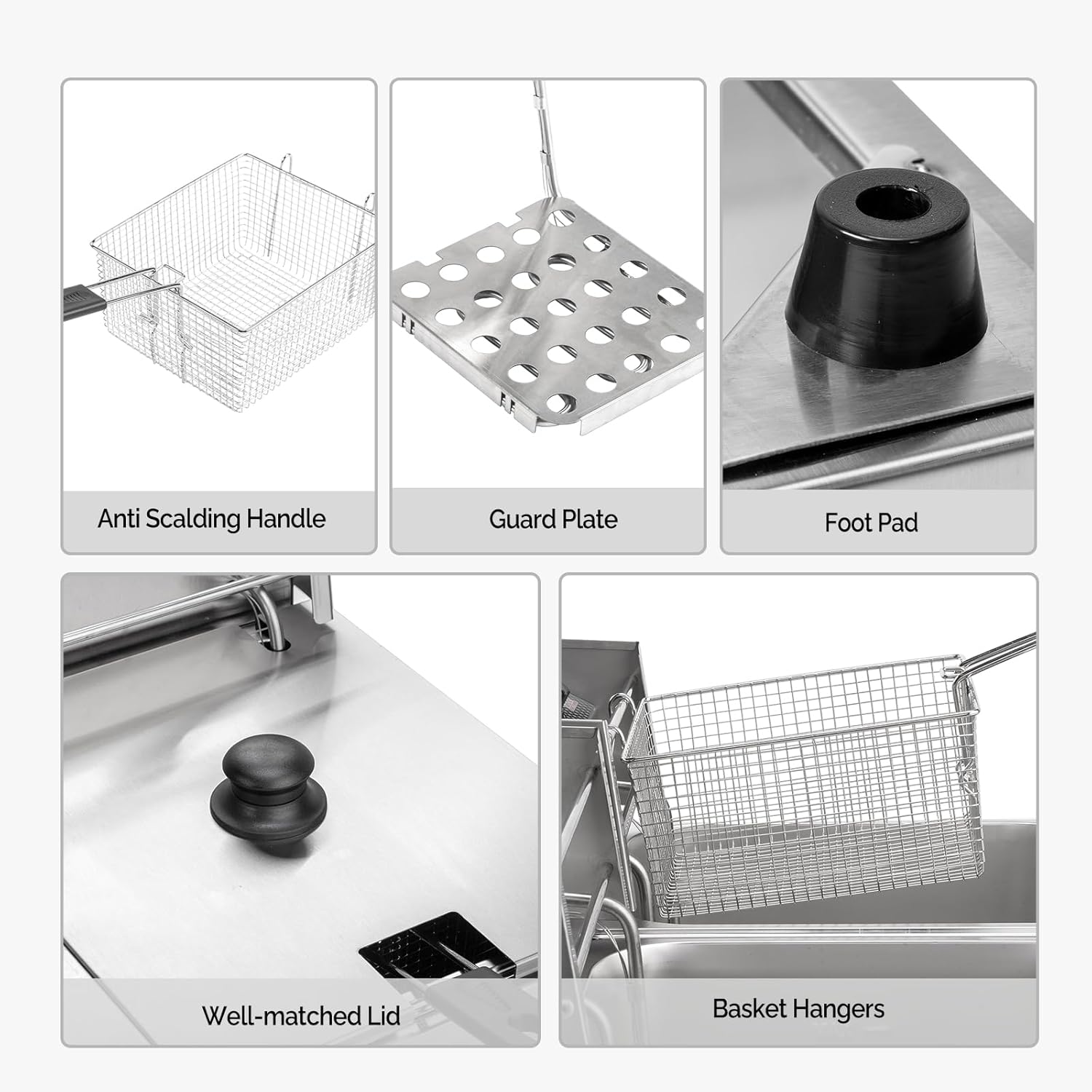 - ENJOY HEALTHY FOOD: The double deep fryer is perfect for commercial use, such as restaurants, supermarkets, fast food stands, snack bars, parties, etc. Suitable for buffalo wings, chicken, dumplings, egg rolls, shrimp rolls, mozzarella sticks, jalapeno poppers, etc.