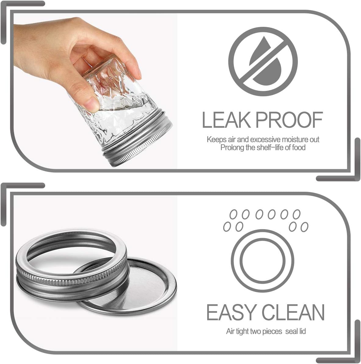 - FOOD GRADE:Each mason jar is made from food grade materials.Great for food storage.Suitable for use in preserving and canning. Safe for the refrigerator and the freezer