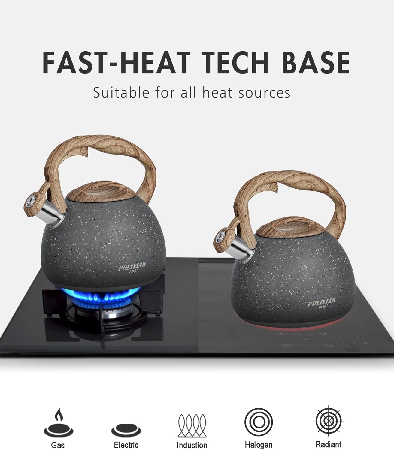 POLIVIAR Tea Kettle, 2.7 Quart Natural Stone Finish with Wood Pattern Handle Loud Whistle Food Grade Stainless Steel Teapot, Anti-Hot Handle and Anti-Rust, Suitable for All Heat Sources (JX2018-GR20)