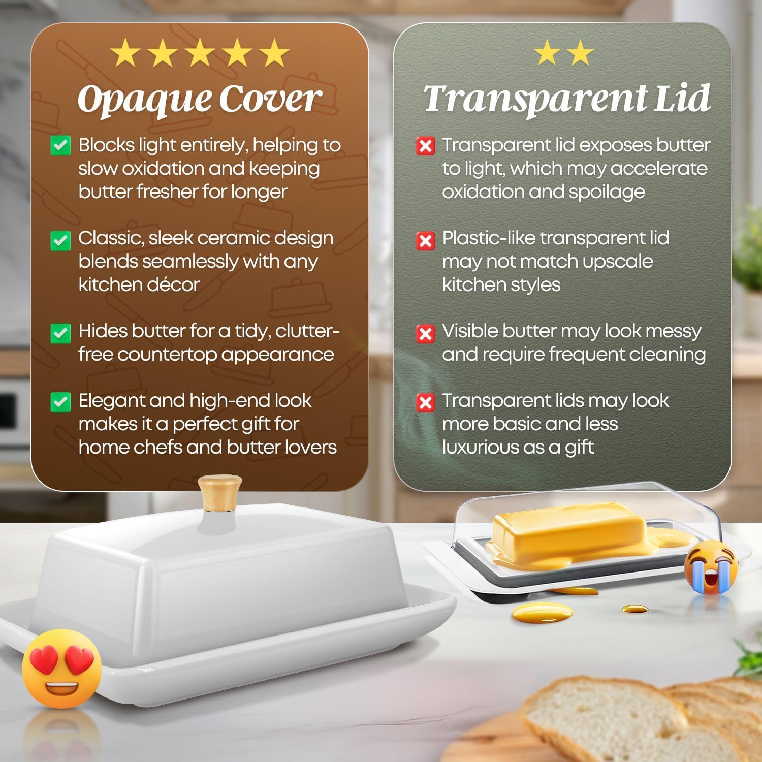- User-Friendly Design: Featuring a matching lid with a top wooden knob, this porcelain butter dish allows you to access your butter with ease and keep it fresh, always