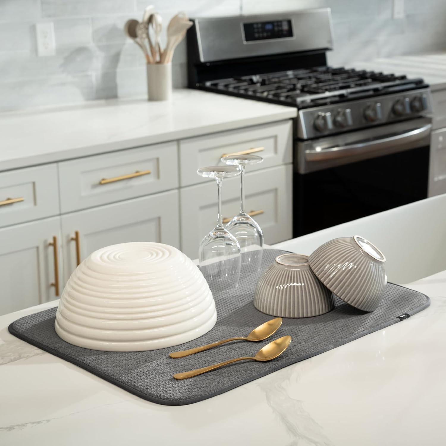 - Dish drying mats for kitchen counter are reusable, machine washable, and easy to store for kitchen organization; durable construction will not chip or break like a stone dish drying mat for kitchen