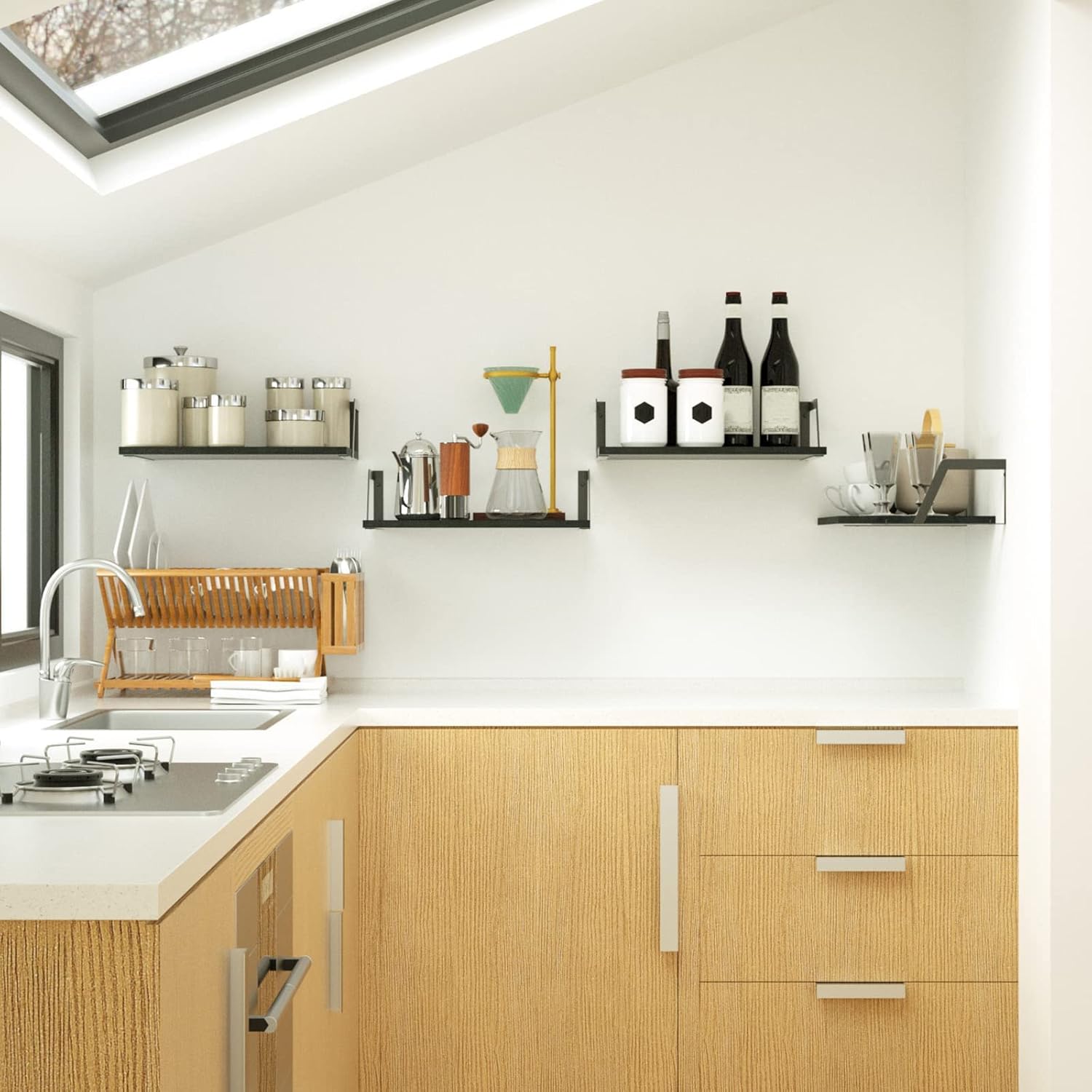 - Functional Wall Shelves: Versatile wood shelves allow you to exhibit photos or plants in the living room, hold beauty products in the bathroom , or hold spices and jars in the kitchen.