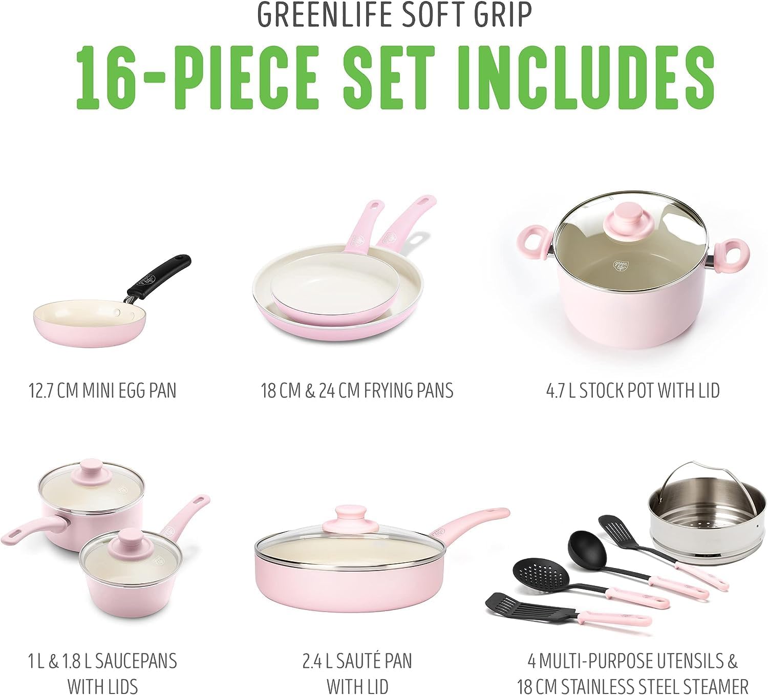 GreenLife 16 Piece Nonstick Cookware Set, Soft Grip Non-Toxic PFAS-Free Ceramic Pots & Pans, Dishwasher & Oven Safe, Frying, Sauce, Saute, Utensils, Glass Lids, Stay-Cool Handles, Wobble Free, Pink