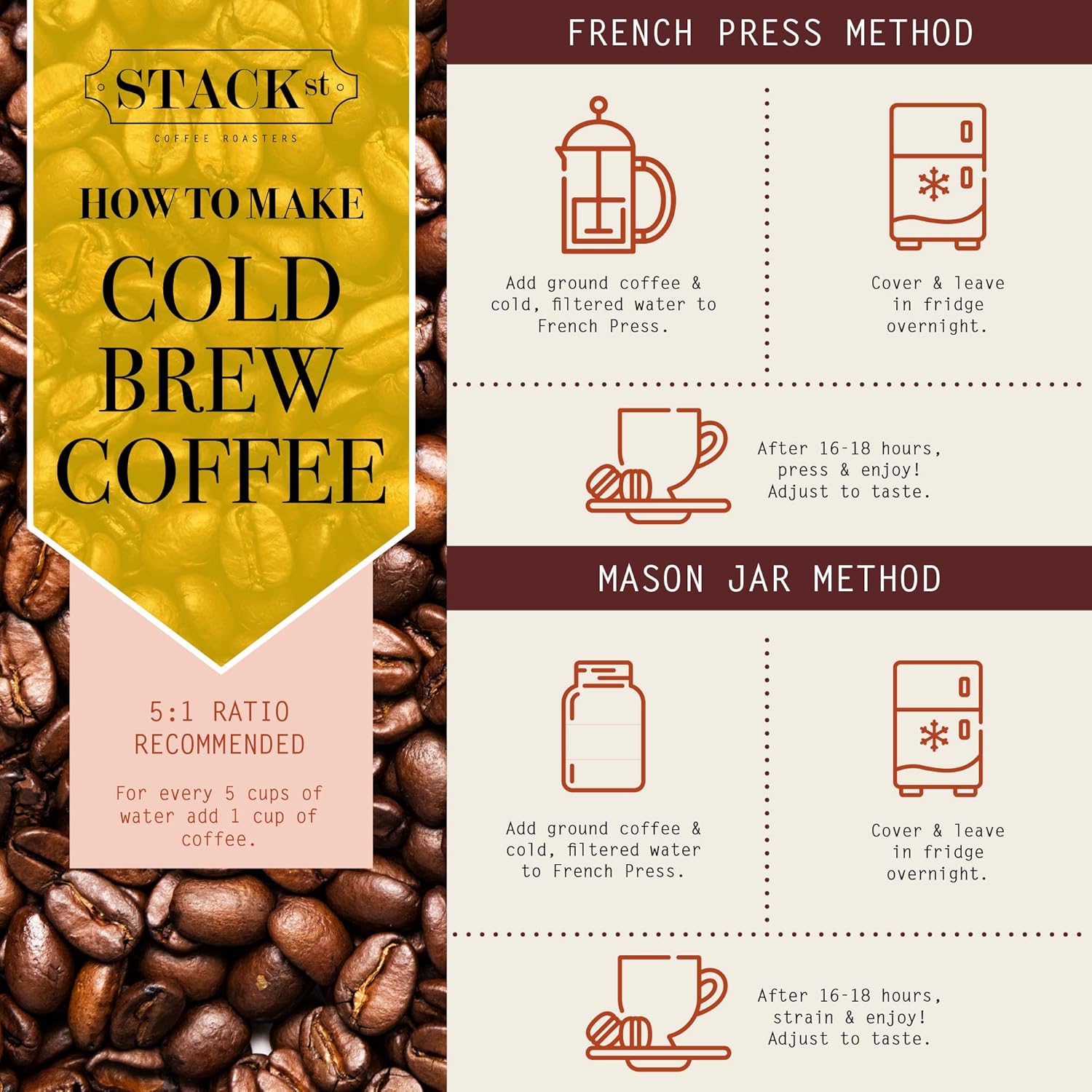 - GOURMET COFFEE: Calling all cold brew and iced coffee lovers! Stack Street cold brew ground coffee is handcrafted, flavorful, aromatic and made using premium quality coffee beans. Pour over ice and enjoy!