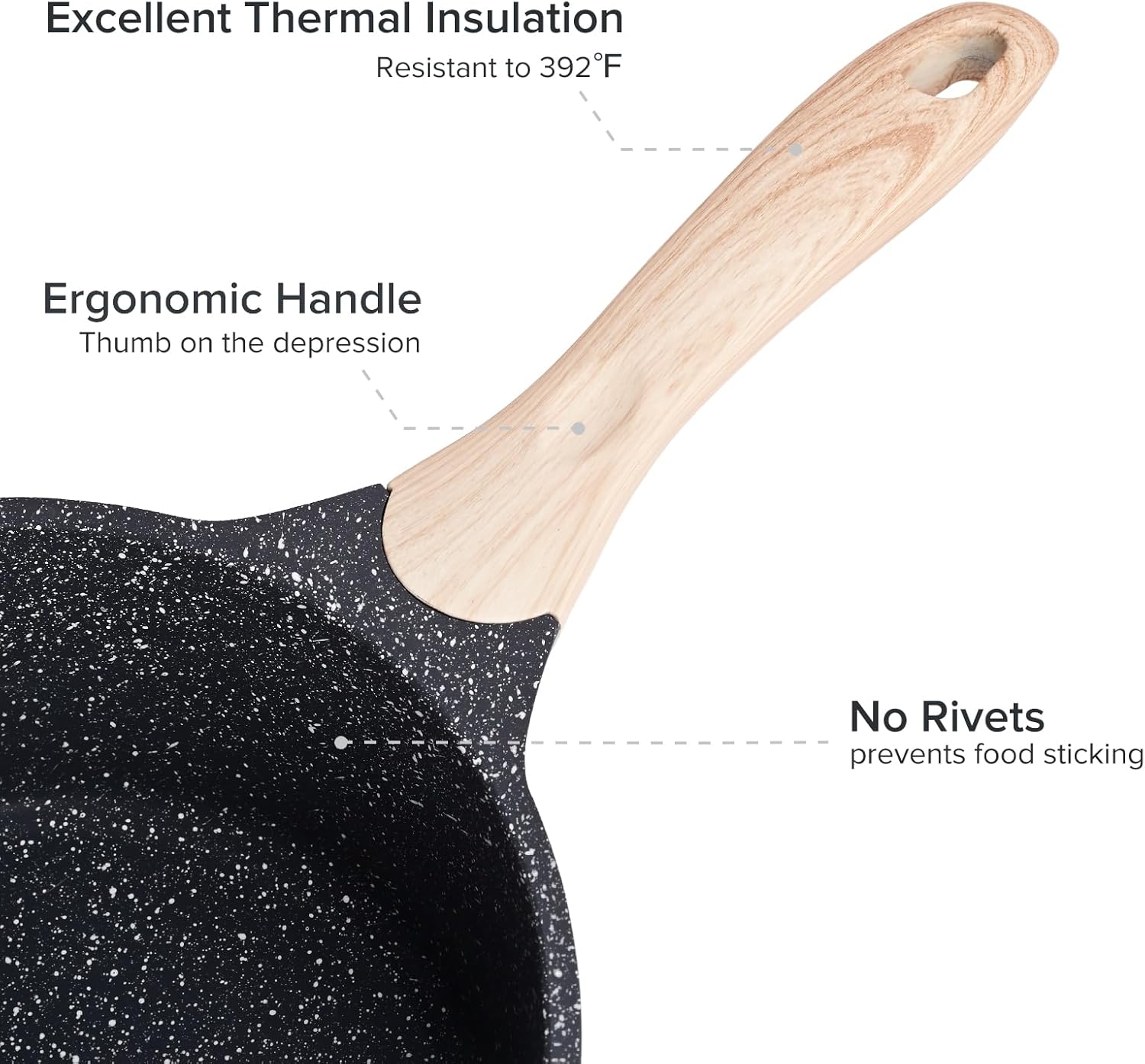 - [Heat-Insulating Handle] - More ergonomic wood grain Bakelite handle for a comfortable grip. Good heat resistance allows it to stay cool while cooking. The safe temperature for nonstick pot is 302β (long time high temperature will shorten the life of the handle)