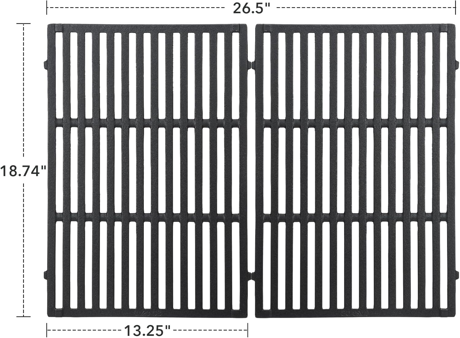- 【DIMENSION & PACKAGE】18.75” x 13.25” for each grate, 18.75” x 26.5” for total. Comes with 2 cast iron cooking grates. Kindly compare with the SIZE and MODEL of your original parts before you order.