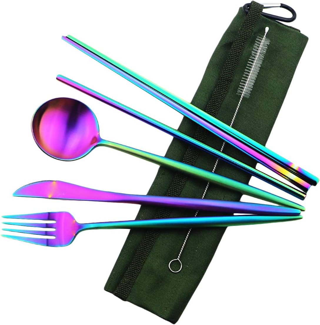 - Perfect Size & 7-Piece Travel Flatware Set Includes - Dinner knife, dinner fork, dinner spoon, chopsticks, cleaning brush, straight straw, carrying case. Suitable for travel, camping, school, flight or workplace.The cutlery is compete in size and light in weight, making it easy to carry around. The 7-piece portable Silverware set is a must-have for daily use, camping, and home travel.