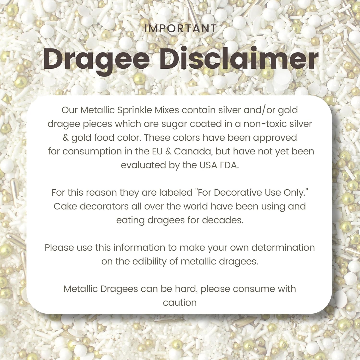 - Metallic Dragees Disclaimer: Silver and gold dragees are commonly used by cake decorators worldwide. While approved for consumption in some regions, they are traditionally labeled as βFor Decorative Use Onlyβ in the U.S. Please use discretion when adding them to your creations