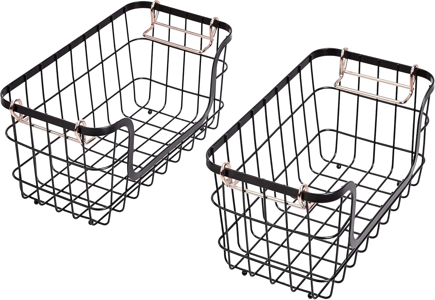 - Set of 2 black wire storage baskets with rose gold handles for home organization