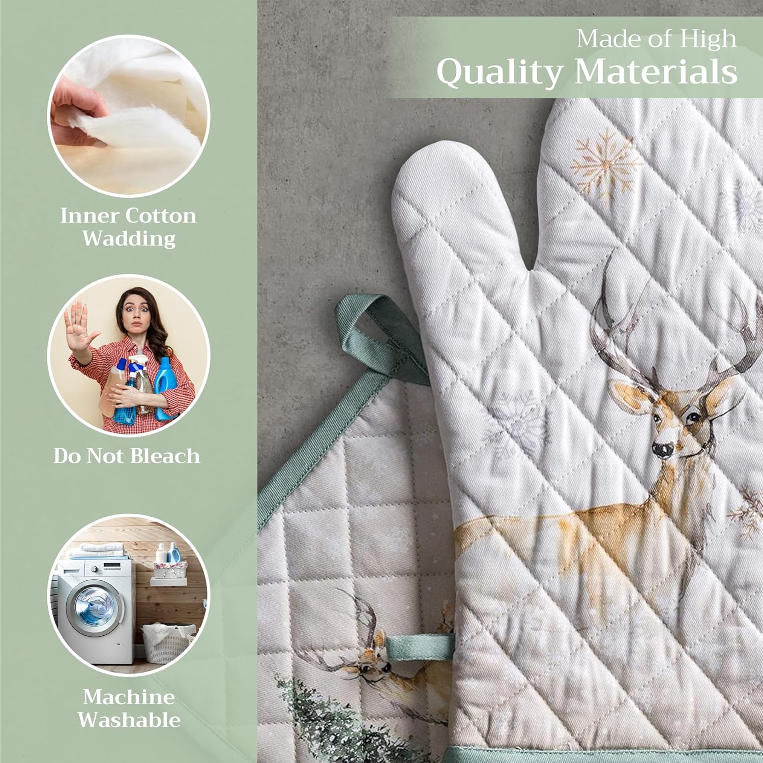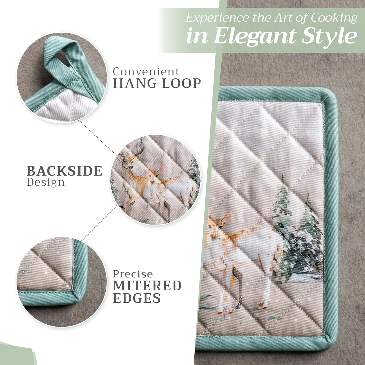 Maison d' Hermine 100% Cotton Oven Mitt & Pot Holder Set (7.5"x13" & 8"x8") Heat Resistant BBQ Cooking Gloves with Loop, Baking, Grilling, Kitchen, Handling Hot Pans (Deer in The Woods)