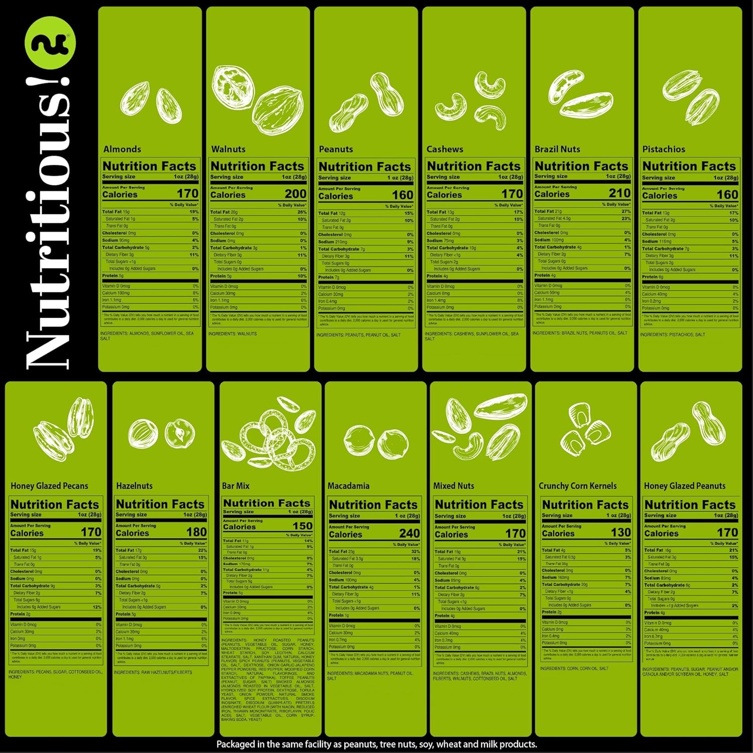 - A SELECTION OF 12 OF OUR BEST NUTS: Our Nuts Wooden Tray includes a handful of 13 of our signature nuts: Roasted & Salted Brazil Nuts, Roasted & Salted Almonds, Roasted & Salted Pistachios, Roasted & Salted Peanuts, Roasted & Salted Cashews, Honey Glazed Peanuts, Raw Hazelnuts, Raw Walnuts, Pretzel Bar Snack Mix, Honey Glazed Pecans, Roasted & Salted Crunchy Corn Kernels, Roasted & Salted Nut Mix, and Roasted & Salted Macadamia Nuts.