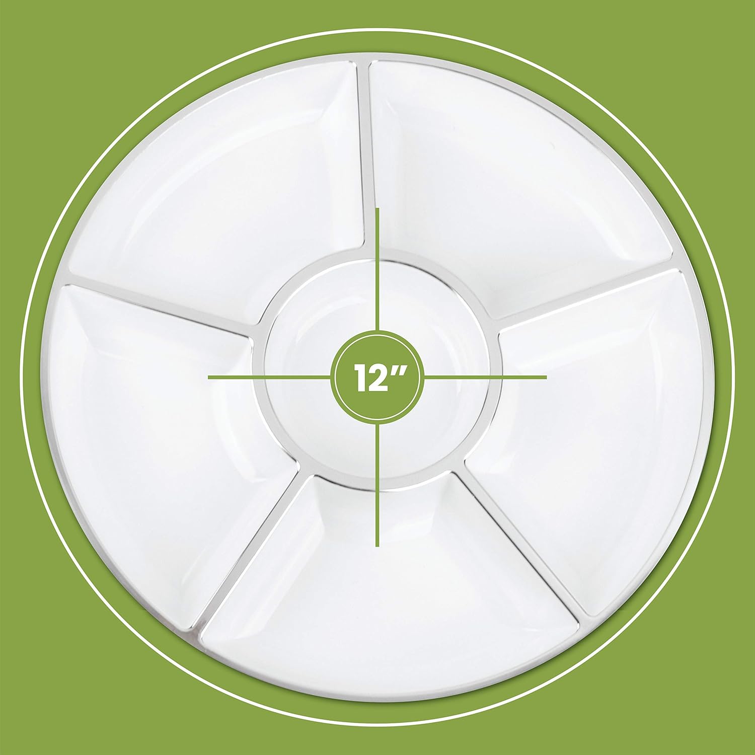 Plasticpro 6 Sectional Round Plastic Serving Tray/Platters White & Silver Pack of 2