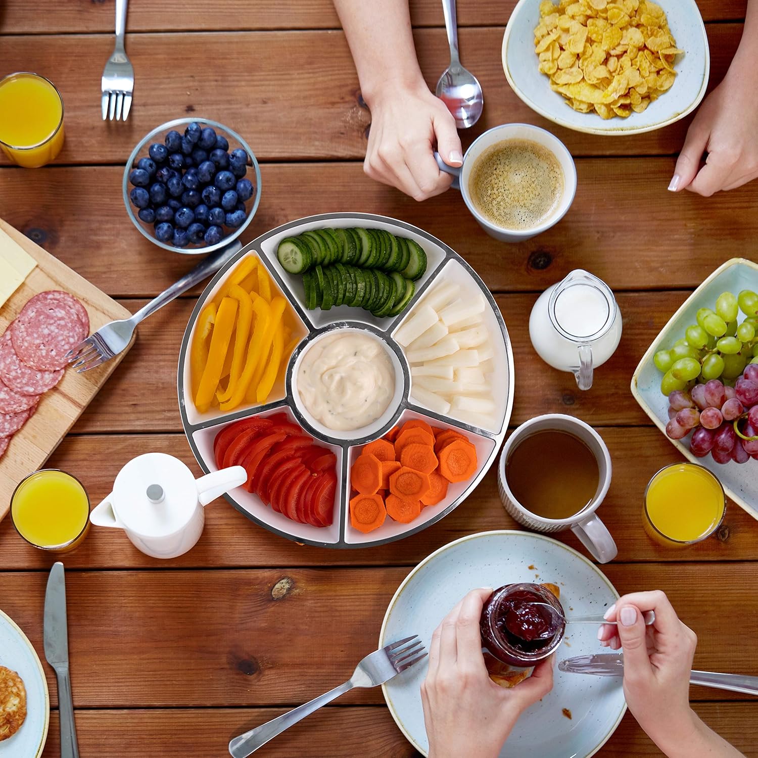 - SIZE 12β round serving plate consists of 6 divided sections with a center dip section which is excellent for serving snacks and appetizers. Its each section are amply sized for chips and salsa, veggies and dip, shrimp and cocktail sauce and much more