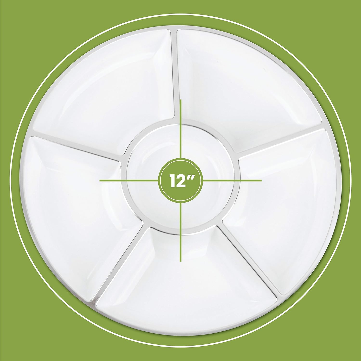 Plasticpro 6 Sectional Round Plastic Serving Tray/Platters White & Silver Pack of 8
