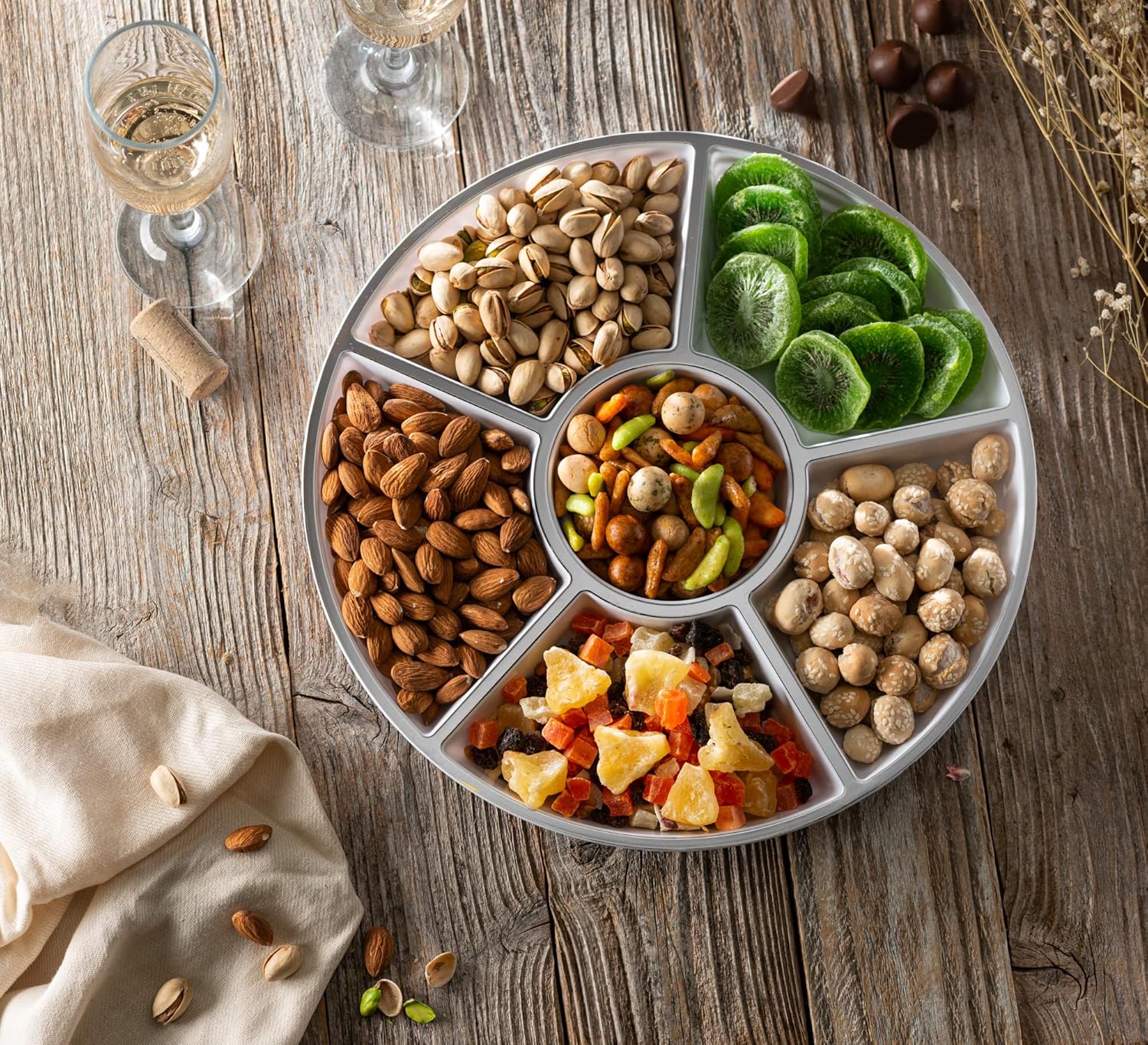 - SIZE 12β round serving plate consists of 6 divided sections with a center dip section which is excellent for serving snacks and appetizers. Its each section are amply sized for chips and salsa, veggies and dip, shrimp and cocktail sauce and much more