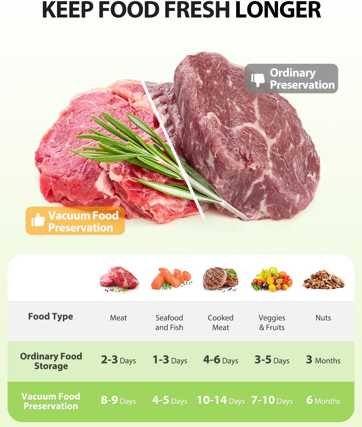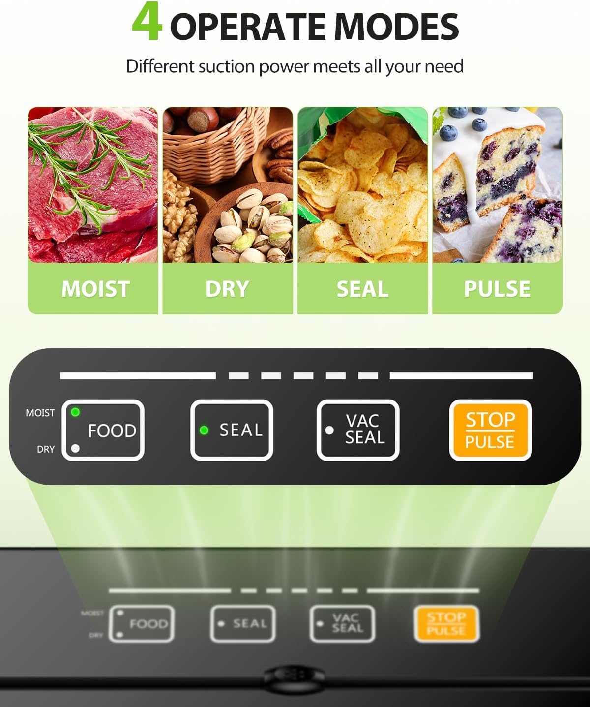 - Two Sealing Modes - Dry & moist food modes with an intelligent LED display easily guide your vacuum and sealing process. Set different types of food you want to seal simply with one-touch smart operation. Extract air quickly, seal your food tightly.