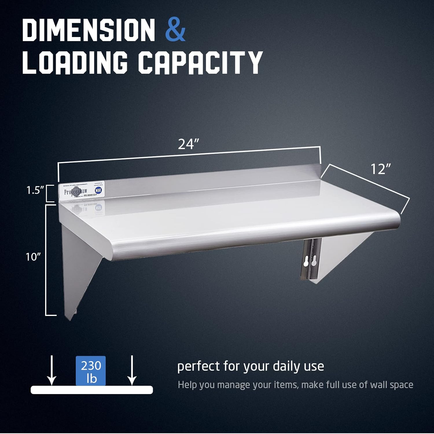 Profeeshaw NSF Stainless Steel Shelf 12” x 24”, 230 lb Commercial Shelves Wall Mounted Metal Shelving with Backsplash and 2 Brackets for Restaurant, Bar, Utility Room, Kitchen and Garage
