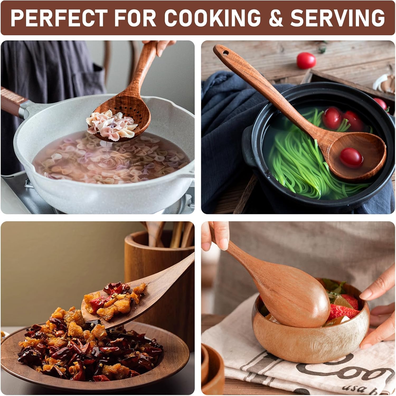 - [Ideal Kitchen Accessories]: Transform your kitchen into a heaven of culinary with our exquisite wooden cooking utensils.Crafted from natural wood and hand-polished to perfection, each piece is free of imperfections, feels as smooth as silk in your hand