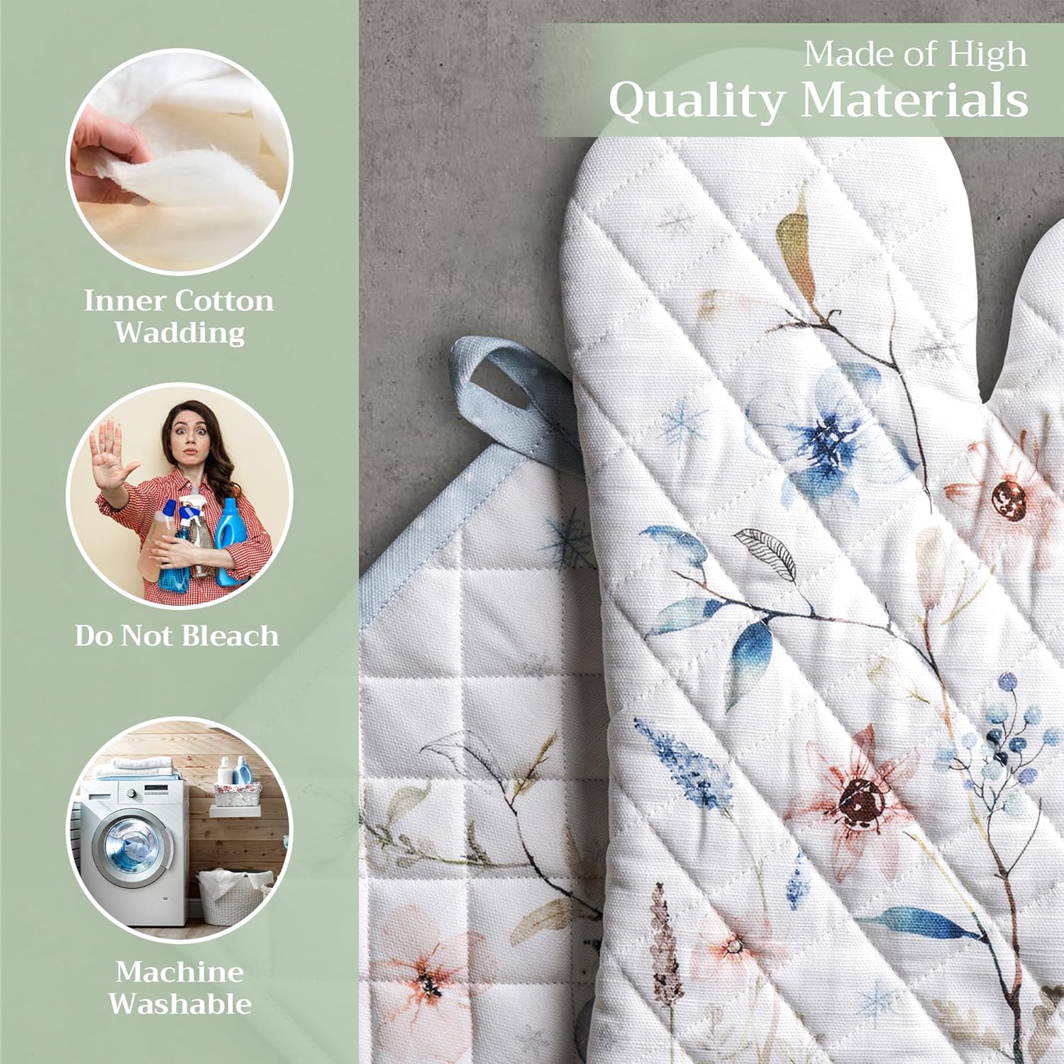 - Artistic style: Add charm to your kitchen with our oven mitt pot holder set featuring watercolor designs inspired by traditional European motifs. Stylish and functional kitchen accessories for every home cook or gift occasion.
