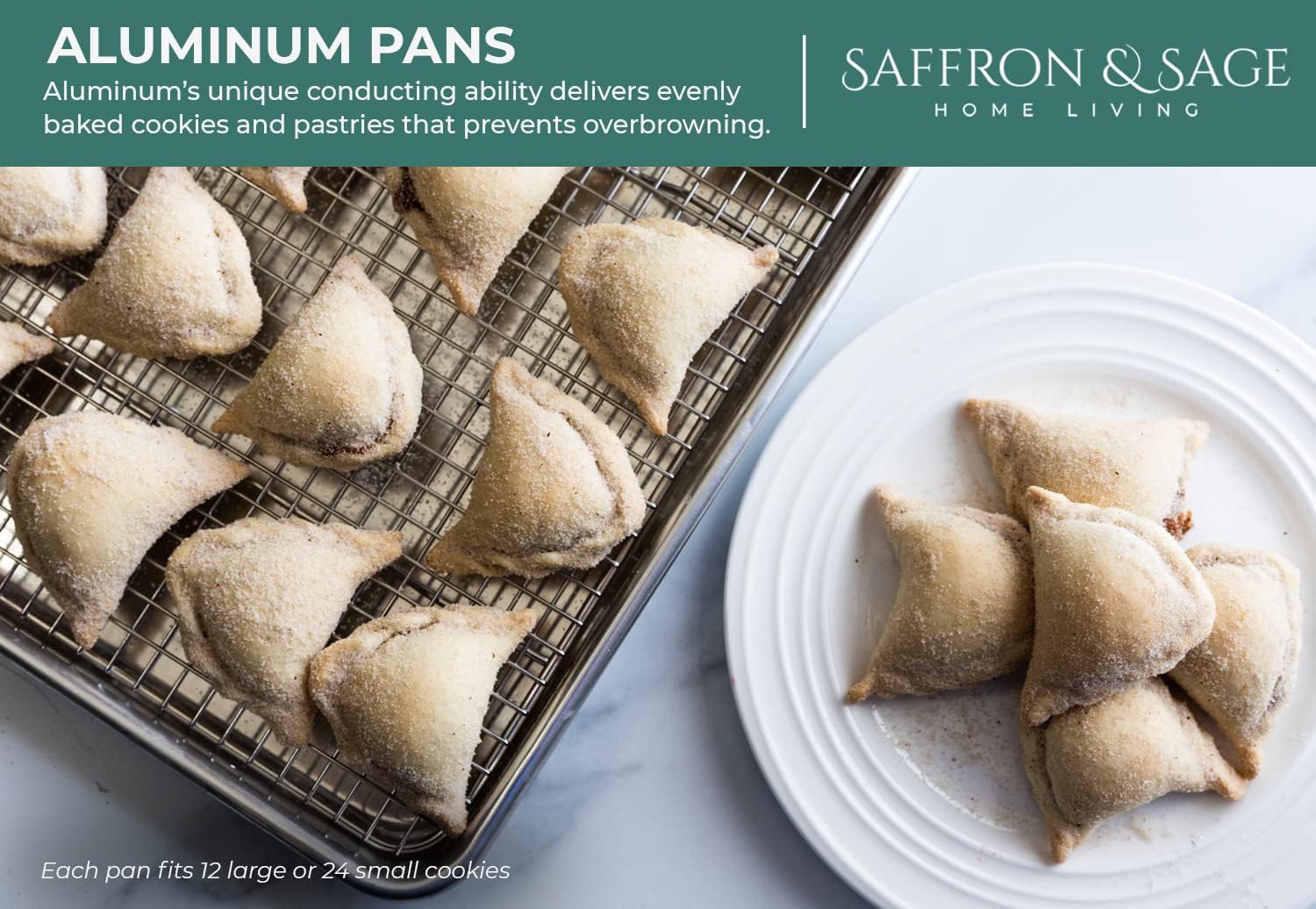 - Unlike other pans for baking that are too thin and warp, or have a coating that peels and rusts, the Saffron & Sage baking tray is made of a thick aluminum gauge with a reinforced steel rim to withstand temperatures of up to 500ยบF / 260ยบC without twisting or warping. Its metal surface has no teflon or other coatings added, therefore this half sheet pan and rack will not peel or rust, making them long lasting.