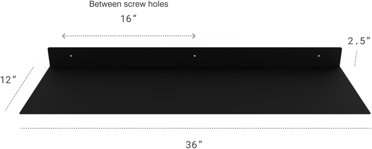 - DIMENSIONS & DETAILS: Measuring 36-inches long x 12-inches in depth, our steel floating shelf is made from 14 gauge raw steel and professionally powder coated matte black. The weight of the shelf is 11 LBS. It's perfect for displaying books, plants, bottles, picture ledges, and retail displays