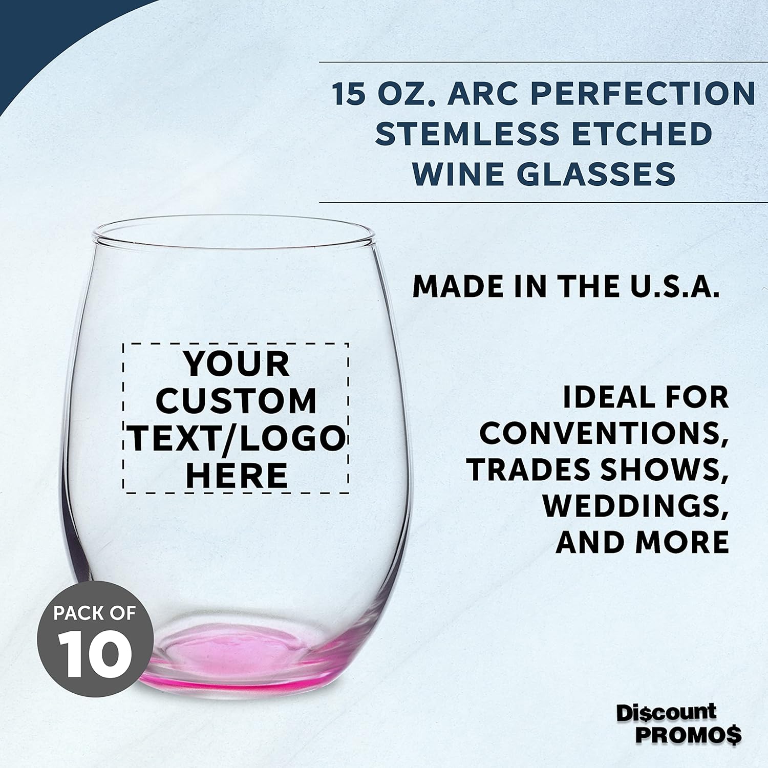 Custom Stemless Wine Glasses in Bulk by ARC Perfection, 15 oz, 10 pack, Personalized Text, Logo, Red or White Wine Glass Set, Pink